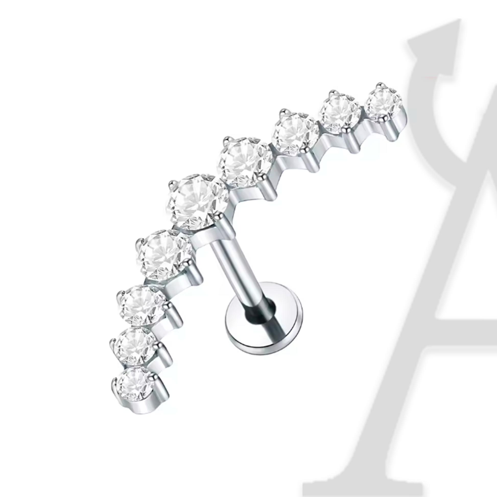 Deixe o seu piercing brilhar com o nosso deslumbrante Labret "Arco de Luz" em Titânio! Esta joia exibe uma elegante fileira de zircónias cúbicas cintilantes meticulosamente cravejadas em um formato de arco delicado, criando um rastro luminoso que capta a atenção.